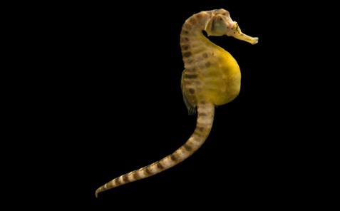 يقوم حصان البحر "ذو البطن الكبير" بالاستعراض والمغازلة، بينما تتنافس الإناث لنيل حظوته واهتمامه؛ فمن المهم للأنثى التزاوج مع ذكر واحد يُعتمد عليه إذ إنه المكلف بحمل البيض - الصورة: Joel Sartore, مشروع "فُلك الصور" لناشيونال جيوغرافيك.