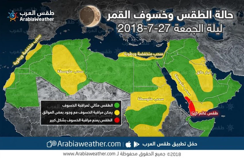 طقس العرب - عمر الدجاني - تشهد المنطقة العربية بأكملها ليلة الجُمعة الموافق لـ 27-7-2018 حدثاً فلكياً مميزاً، يتمثل بخسوف كلي للقمر، يُعد الأطول في القرن الحادي والعشرين، يبدأ الساعة 9:24 ليلاً بتوقيت مكة المكرمة، وينتهي بالساعة 1:19 بعد منتصف الليل.