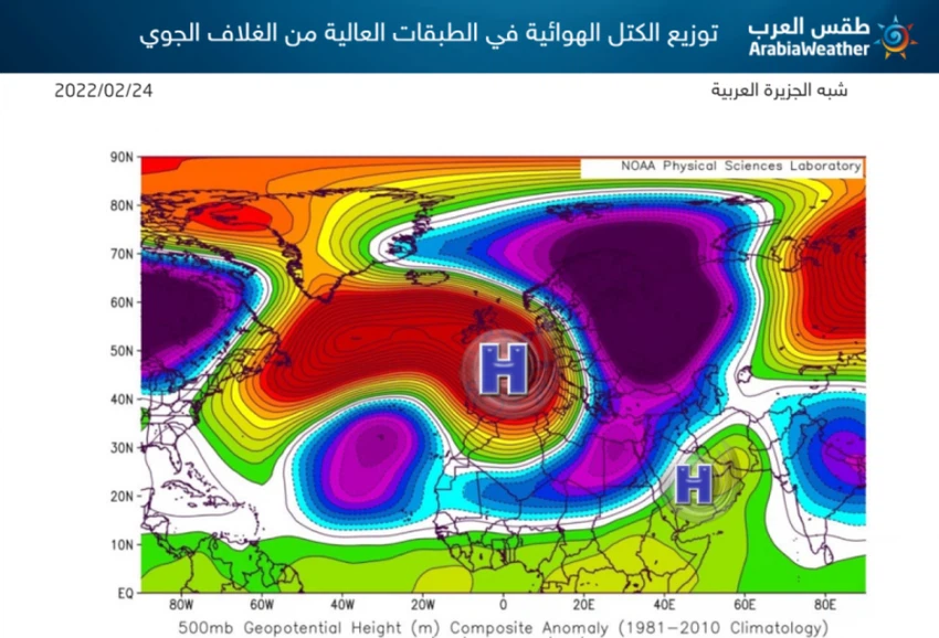 وتوضح الخريطة الجوية المرفقة، إلى تركز النشاط العلوي بين شرق ووسط البحر المُتوسط أي بين مصر وليبيا، بينما بقيت أغلب مناطق شبه الجزيرة العربية قابعة تحت ظلال المرتفع الجوي شبه المداري، والذي له دور محوري في صد الموجات الرطبة سواءَ من الجنوب القادمة من بحر العرب او من الشمال القادمة من البحر المتوسط و بلاد الشام، والذي يجلب استقرار عام على الأجواء وسيطرة طقس بارد. ومع استمرار ثبات توزيع الكتل الهوائية والأنظمة الجوية من المحيط الأطلسي والقطب الشمالي والقارة الأوروبية، أدى ذلك الى بقاء المرتفع الجوي شبه المداري ثابت يُرواحه مكانه مُعظم الفترات.