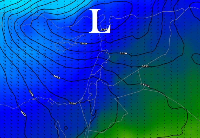 وتبدأ التغيرات الجوية اعتباراً من ليلة السبت، وذلك على إثر تمدد منخفض البحر الأحمر من الشرق نحو المملكة، يترافق مع اندفاع رياح أكثر برودة في طبقات الجو قادمة من الغرب، حيث يؤدي دخول الهواء البارد الى اضطراب جوي (ضعيف) في طبقات الجو المتوسطة والعالية، يتمثل بتكاثر الغيوم المتوسطة والعالية مع تهيؤ الفرصة لهطول زخات محلية عشوائية من الأمطار مع ساعات الليل وصباح الأحد.
