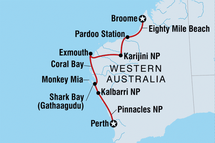 إذا اخترت أن تواصل شمالا باتجاه منطقة كيمبرلي في نهاية الطريق الساحلي الغربي، ستكون أمام رحلة أسبوع على الأقل تمر فيها بحديقة كاريجيني الوطنية ثم إلى بورت هيدلاند ثم شاطئ الثمانون ميلًا (أيتي بيش) وأخيرًا بروم ثم كيمبرلي.