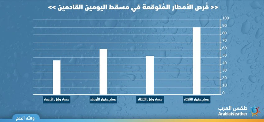 وتُشير نواتج التحليلات داخل مركز "طقس العرب" الإقليمي للأرصاد بالإضافة إلى مُخرجات المُحاكاة الحاسوبية بأن فرص الأمطار على مدنية جدة خلال اليومين القادمين كما يلي :