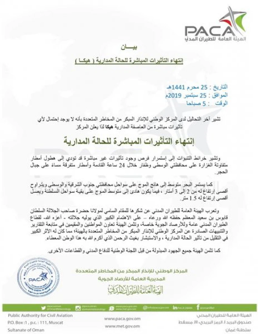 طقس العرب - سنان خلف - تُظهر آخر صور الأقمار الإصطناعية المُستلمة لدينا في طقس العرب التلاشي السريع لكتلة السُحب المُصاحبة للحالة المدارية هيكا التي أثرت على سلطنة عُمان خلال الـ 24 ساعة الماضية، كما وأصدرت الأرصاد العُمانية بيان رسمي تُعلن فيه انتهاء التاثير المُباشر للحالة المدارية هيكا على السلطنة، وفيما يلي نص البيان: