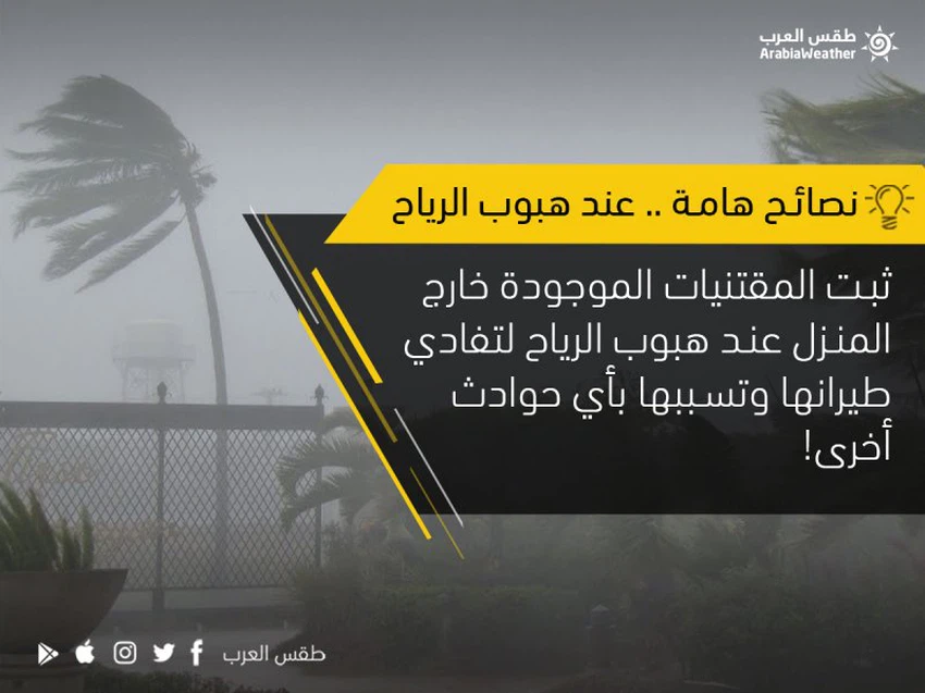 و تحتاج الحالةالجوية المقبلة أخذ الحيطة والحذر من قبل المواطنين، خاصة من شدة الرياح التي قد تتجاوز سرعة هباتها 100كم/ الساعة، لذا لا بد من اتباع الإرشادات التالية: