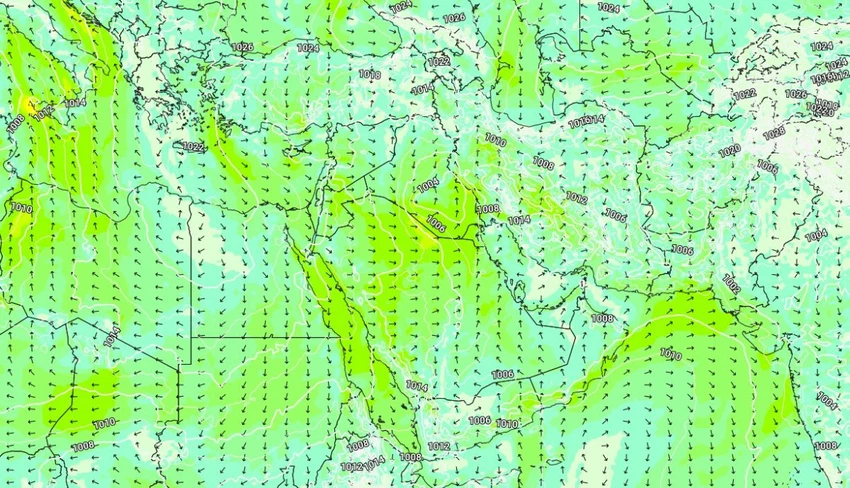 وفي التفاصيل : قال المختصون في طقس العرب أن اضطراب جوي يتوقع أن يؤثر على شمال السعودية والعراق نهار يوم غد الإثنين يتمثل باندفاع كتلة هوائية باردة نسبياً في طبقات الجو العالية نحو شمال السعودية، ونتيجة لتواجد كتلة هوائية حارة نسيباً إلى الشرق من الجزيرة العربية، يتوقع أن تتشكل منطقة من الضغط الجوي المنخفض شمال شرق السعودية وجنوب العراق بفعل فرق الضغط الجوي مما سيؤدي بمشيئة الله لهبوب رياح قوية مثيرة للغبار والأتربة.