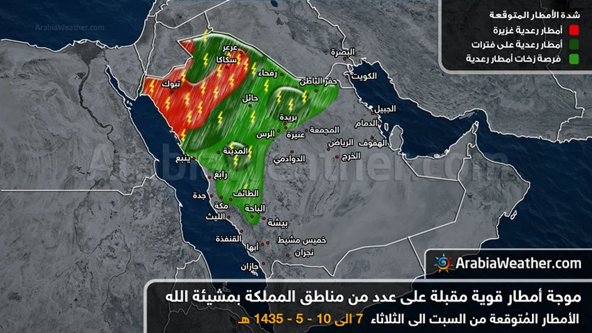 موقع ArabiaWeather.com- عمر الدجاني- تُشير التوقعات إلى تأثُر أجزاء واسعة من شمال السعودية و بعض المناطق الغربية والوسطى بحالة جويّة ماطرة اعتباراً من مساء السبت و يوم الأحد تُصنف بأنها قويّة الفعالية، لذا فإنه يُستحسن أن يتم التحضير لها و التحذير منها حتى تمر الحالة الجويّة على خير وسلام بإذن الله.