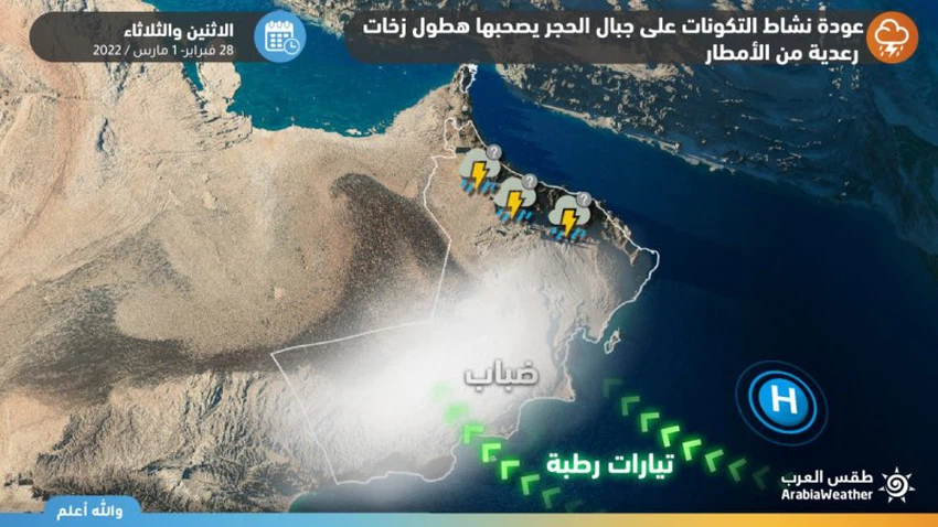 وتشير تحليلات مركز طقس العرب بأنه في ظل ارتفاع درجات الحرارة السطحية وتدفق بخار الماء من بحر عُمان وتواجد تبريد في طبقات الجو المنخفضة، تنشط على إثر ذلك السحب الرُكامية على أجزاء من جبال الحجر، يصحبها هطول زخات رعدية من الأمطار بمشيئة الله على مناطق عشوائية ومحدودة عموماً وبالأخص يومي الإثنين والثلاثاء.