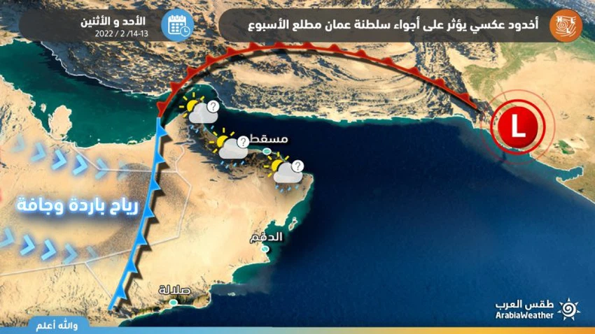 طقس العرب - تُشير خرائط النمذجة الحاسوبية إلى توقعات بتحرك أخدود منخفض جوي يتواجد فوق الأراضي العراقية شرقاً نواحي باكستان، ليؤثر على أجواء السلطنة يومي الأحد والإثنين 13 و 14 فبراير 2022 مُترافق بانخفاض كبير على درجات الحرارة، وهطولات مطرية على بعض المناطق الشمالية من عُمان بمشيئة الله.