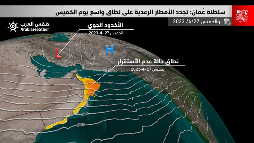 طقس العرب - تُشير آخر الخرائط الجوية توقعات باستمرار تأثير أخدود المنخفض الجوي على أجواء السلطنة يومي الخميس و الجمعة 27 و 28 أبريل 2023، فيما يبتعد عن أجواء السلطنة بدءاً من يوم السبت بحيث تضعف فرص الأمطار عن مُعظم المناطق بمشيئة الله.