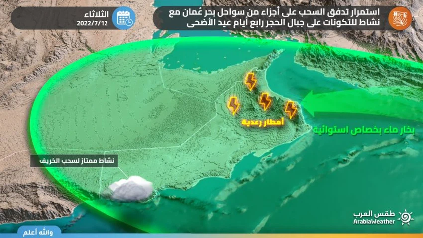 وفي التفاصيل، يستمر تدفق السُحب على ارتفاعات مُختلفة على مُعظم محافظات السلطنة يوم الثلاثاء يتخللها بعض السُحب المُمطرة على أجزاء مُتفرقة من المناطق الساحلية المُطلة على بحر عُمان خاصةً مع ساعات الفجر والصباح، كما يتجدد نشاط التكونات المحلية على جبال الحجر والمناطق المُجاورة مع ساعات النهار تترافق بهطول أمطار مُتفاوتة الغزارة تكون رعدية أحياناً مصحوبة بنشاط للرياح الهابطة تجري على إثرها الأودية في بعض المناطق.