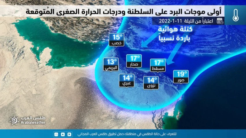 أما خلال ساعات الليل، فيكون الطقس مائلاً للبُرودة في أغلب أنحاء السلطنة، و بارداً فوق المُرتفعات الجبلية و السهول و الصحاري، و تبقى الفرصة واردة لهطول زخات محلية من المطر على أجزاء من سواحل ظفار.