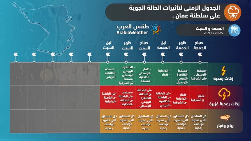 سلطنة عُمان | المخطط الزمني للحالة الماطرة وأبرز الظواهر الجوية المصاحبة لها والمناطق المُتأثرة بها خلال نهاية الأسبوع