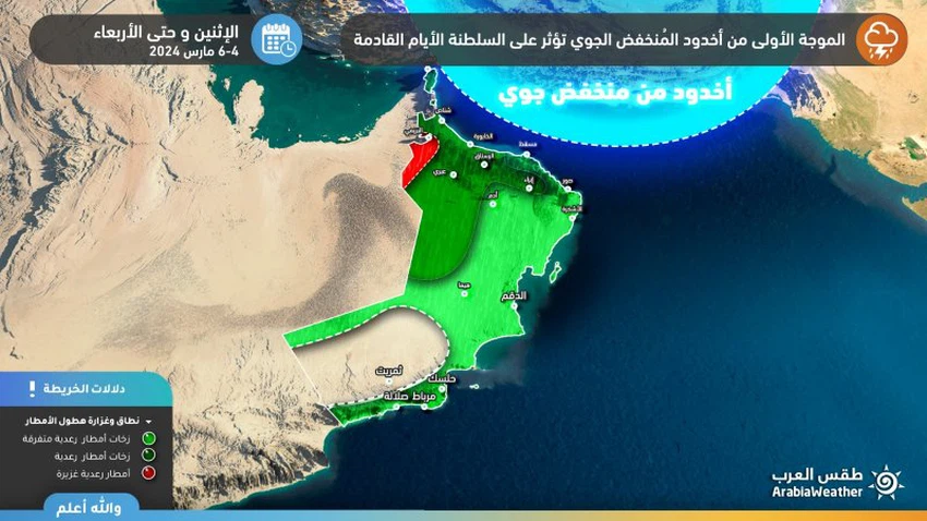 و تدريجياً بعد منتصف ساعات الليل و الثلاثاء، يتزايد تأثر السلطنة بأخدود المُنخفض الجوي، بحيث تشتد الهطولات المطرية على مُحافظات البريمي و شمال الباطنة و البريمي و الداخلية و الظاهرة و أجزاء من الوسطى و تكون هذه الهطولات مُتفاوتة الغزارة و مصحوبة بحدوث العواصف الرعدية أحياناً و تساقط بعض البَرَديات خاصة الجبال مما يؤدي إلى جريان الأودية و الشِعاب.