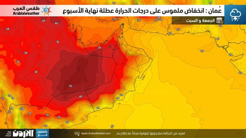 طقس العرب - تُشير الخرائط الجوية إلى توقعات بحُدوث إنخفاض في درجات الحرارة على أغلب مناطق السلطنة اعتباراً من يوم الجمعة بحيث تُصبح أقل من مُعدلاتها المُعتادة، مع استمرار مُتوقع في نشاط سحب الخريف على سواحل مُحافظة ظفار تترافق مع تساقط الرذاذ أحياناً وخاصةً يوم السبت.
