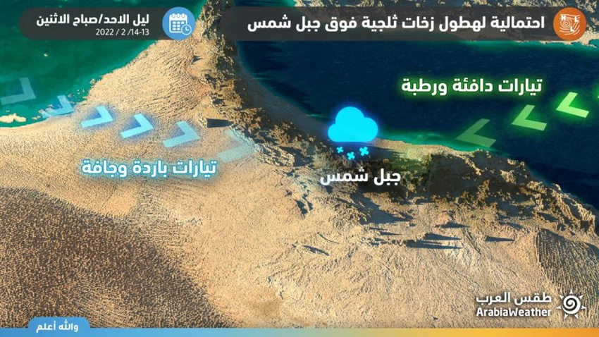 ومن المُرتقب أن تتشكل كميات كثيفة من السحب الطبقية في بحر عُمان واندفاعها للعديد من المناطق الشمالية وذلك إبان بداية عبور السلطنة جبهة هوائية باردة، لتنخفض درجات الحرارة إلا ما دون درجة التجمد بِعدّة درجات مئوية على جبل شمس، لتكون الفرصة مهيأة بذلك لسقوط زخات ثلجية على جبل شمس، ويُنبه طقس العرب حيالَّ ذلك من انخفاض درجات الحرارة إلى مُستويات شتوية في أجزاء عِدّة من السلطنة خاصةً يوم الإثنين 14-02-2021، ومُراعاة العودة إلى لبس الملابس الشتوية نظراً لبرودة الأجواء، ومُراعاة الاستخدام الآمن لوسائل التدفئة، والانتباه من مخاطر تشكل الصقيع فوق القمم الجبلية.