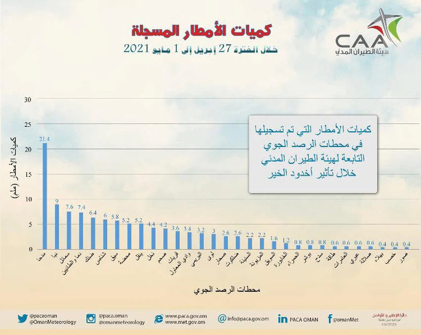 وتالياً كميات الامطار المُسجلة خلال تأثير اخدود الخير في مختلف مُحافظات السلطنة بحسب محطات هيئة الطيران المدني: