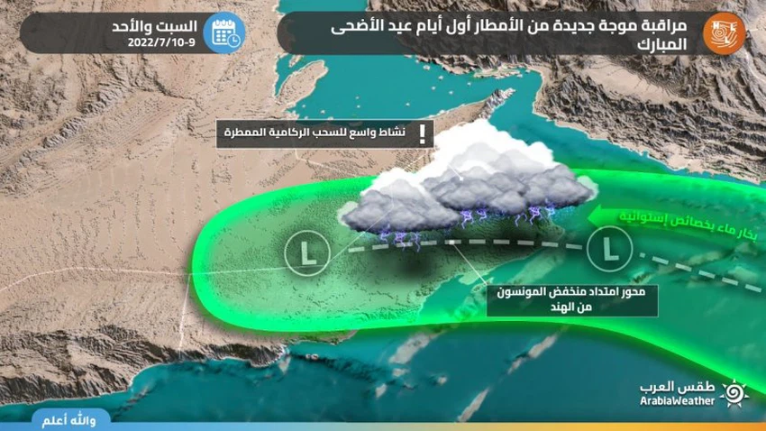 طقس العرب - تُشير أحدث قراءات الخرائط الجوية إلى توقعات بتأثر السلطنة بموجة ماطرة جديدة أول أيام عيد الأضحى المُبارك (السبت و الأحد) نتيجة استمرار تأثير امتداد منخفض جوي قادم من شمال الهند، ومن المُتوقع أن تشمل موجة الأمطار أغلب مُحافظات السلطنة بمشيئة الله. ويُعتبر تأثر السلطنة بهذه الموجات الماطرة أمراً غير معهود في هذا الوقت من العام.