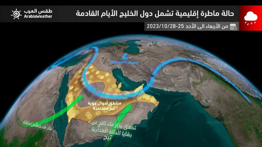 و يُتوقع بمشيئة الله أن تتركز فرص تكون السُحب الركامية فترة ما بعد الظهر و المساء من يوم الأربعاء على مُرتفعات الحجرين الغربي و الأوسط و يرافقها هطول أمطار مُتفاوتة الغزارة مصحوبة بحدوث الرعد و نشاط في التيارات الهابطة مع احتمالية جريان الأودية و الشعاب.
