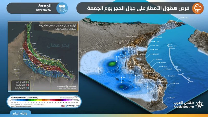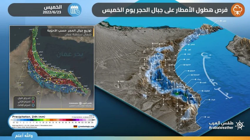 طقس العرب - تُشير الخرائط الجوية إلى توقعات بتجدد فُرص التكونات المحلية على جبال الحجر خلال نهاية الأسبوع ، تترافق بهطول زخات رعدية من المطر على بعض المناطق بمشيئة الله.