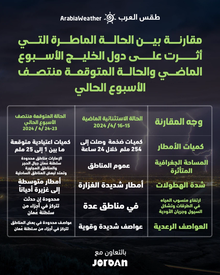 تشير التوقعات لدينا في مركز "طقس العرب"، بأن الحالة المتوقعة تختلف كلياً عن الحالة الماضية من ناحية كميات الأمطار وشدتها، ومن ناحية المساحة الجغرافية المتأثرة، بالإضافة إلى فرص تشكل السيول وجريان الأودية وارتفاع منسوب المياه في الطرقات والعواصف الرعدية المصاحبة لها، حيث أن الحالة المتوقعة هي حالة اعتيادية بوجه عام، وتأثيرها بالدرجة الأولى سيكون في سلطنة عُمان بمشيئة الله ومحدوداً في دولة الإمارات العربية المتحدة.