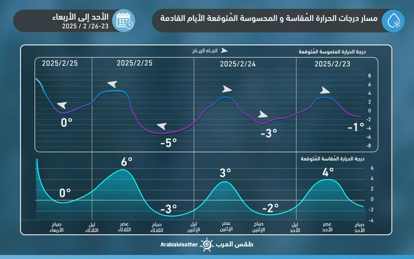 وبحسب البيانات الجوية ومخرجات النمذجة العددية، فإنه من المتوقع أن تهبط درجات الحرارة المحسوسة ( ما نشعر به ) إلى 7 درجات تحت الصفر المئوي مع فجر وصباح يوم الثلاثاء القادم، بحيث يكون الشعور بالبرودة القارسة استثنائياً وذلك نتيجة نشاط سرعة الرياح الجنوبية الشرقية ويكون في مستويات غير معهودة في مختلف مناطق المملكة.
