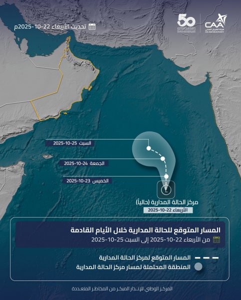 طقس العرب – أصدرت هيئة الطيران المدني في سلطنة عمان تقريرها رقم (2) اليوم الأربعاء 22 أكتوبر 2025م، حول الحالة الجوية في بحر العرب حيث تشير آخر صور الأقمار الاصطناعية وتحليلات المركز الوطني للإنذار المبكر من المخاطر المتعددة إلى تمركز منخفض مداري جنوب بحر العرب على خط طول 68.2° شرقًا ودائرة عرض 8.8° شمالًا، مع تقدير سرعة الرياح حول المركز بين 38 و46 كم/ساعة.