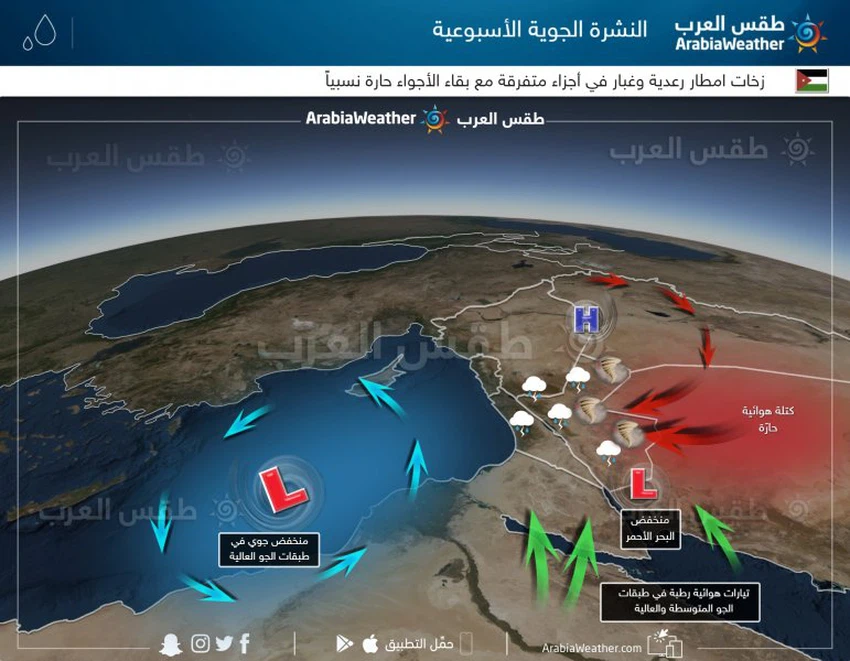 وبالرغم من توقع هطول الأمطار، الا أن درجات الحرارة ستبقى مرتفعة، وتكون أعلى من معدلاتها العامة بحدود 3-5 درجات مئوية.