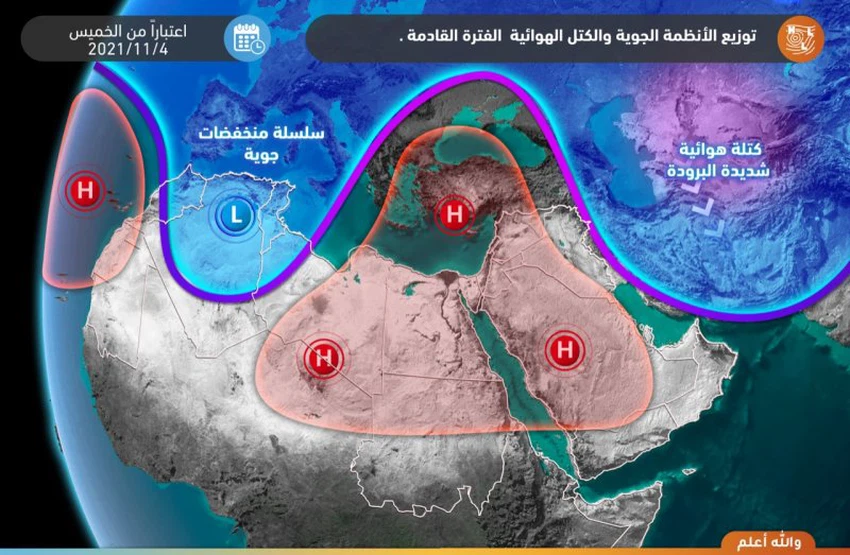 وفي التفاصيل، يُتوقع أن تُسيطر منظومة جوية تخدم منطقة غرب القارة الاوروبية وغرب البحر المتوسط ودول المغرب العربي خلال الأسبوعين القادمين، بحيث يبقى المرتفع الجوي الازوري ممتداً شمالاً حتى شمال المحيط الاطلسي يدفع بكتل هوائية باردة جنوباً نحو غرب اوروبا ثم غرب البحر المتوسط، وتعمل المياه الدافئة للبحر المتوسط على اشتداد المنخفضات الجوية وضخ كميات من الرطوبة ما يزيد من فعاليتها.