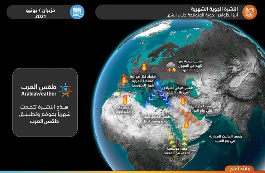 حول الى اعلى من المعدل / طقس صيفي اعتيادي الى حار نسبي نهارا ومعتدل الى مائل للدفء ليلا