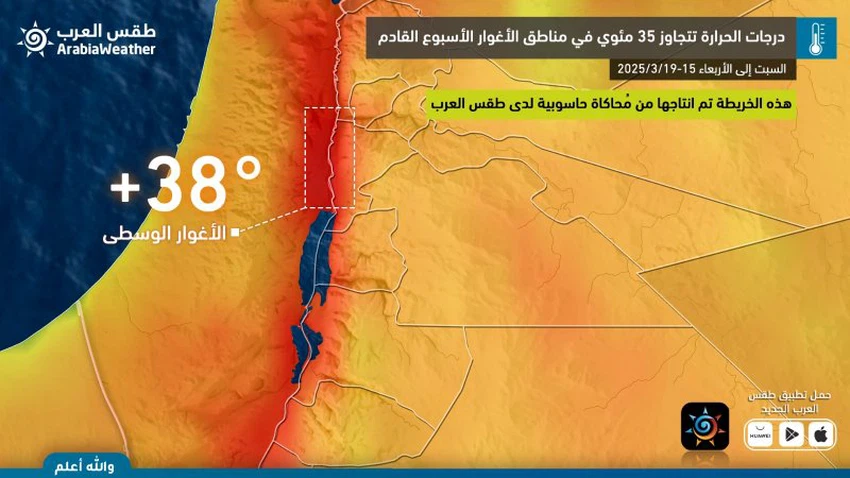 ومن المتوقع ان تتجاوز درجات الحرارة حاجز ال35 مئوية في الأغوار والبحر الميت والعقبة الأسبوع القادم ان شاء الله.