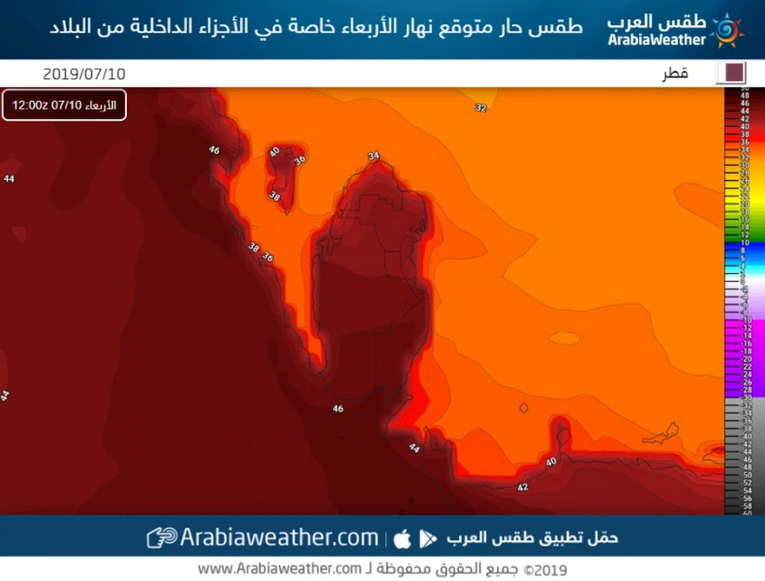 من المُتوقع بمشيئة الله أن يستمر الطقس الحار مُسيطراً على البلاد نهار الأربعاء، وخاصة الأجزاء الداخلية منها، وتكون درجات الحرارة العظمى بحدود الـ 46 درجة مئوية في العاصمة الدوحة.