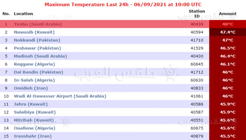 طقس العرب - بعد اكتمال تسجيل درجات الحرارة العظمى لليوم الأربعاء 2021/6/9 وبحسب ما جاء في جدول مؤشر الحرارة العالمي الخاص بمنظمة الأرصاد العالمية، تصدرت منطقة ينبع الواقعة في المملكة العربية السعودية أعلى درجة حرارة على وجه الأرض اليوم الأربعاء بواقع 48 درجة مئوية.