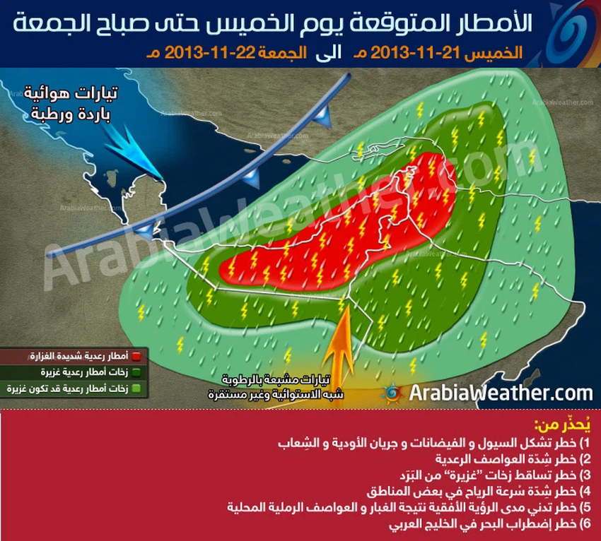 وتشير آخر التوقعات الجوية الصادرة عن مركز "ارابيا ويذر" الاقليمي إلى أن الأمطار ستكون غزيرة ومترافقة مع حدوث العواصف الرعدية في مختلف المناططق بمشيئة الله.