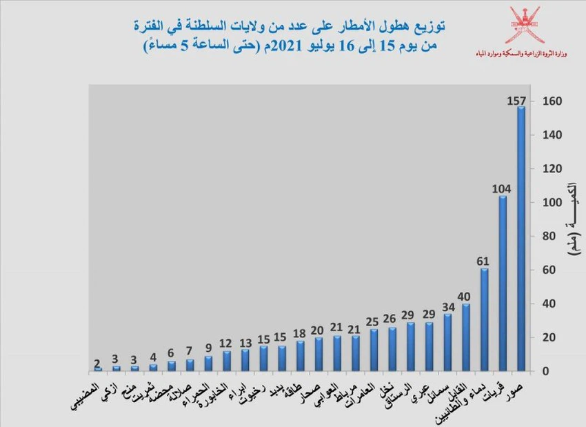 طقس العرب - سنان خلف - نشرت وزارة الثروة الزراعية والسمكية وموارد المياه في السلطنة توزيع وكميات الأمطار الهاطلة على السلطنة في الفنرة من 15 إلى 16 يوليو 2021م.