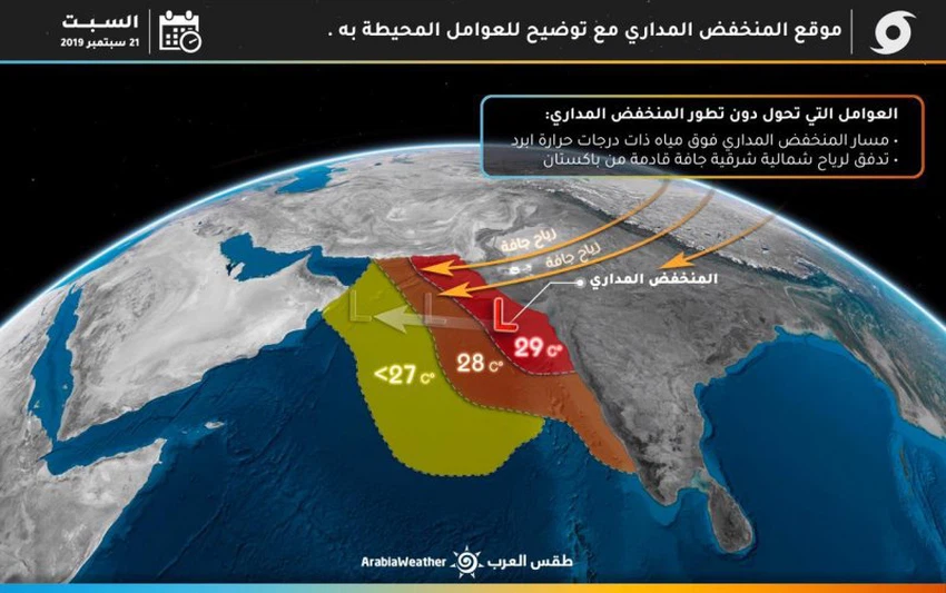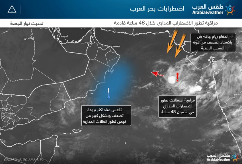 تشير التوقعات الخاصة بطقس العرب، والتي تم تطويرها ودمج البيانات الديناميكية والاحصائية معاً، الى ارتفاع فرص تشكل حالات مدارية في بحر العرب خلال شهر أكتوبر / تشرين أول، لاسيما في النصف الثاني من الشهر، وسيتم نشر المزيد عن ذلك لاحقاً،