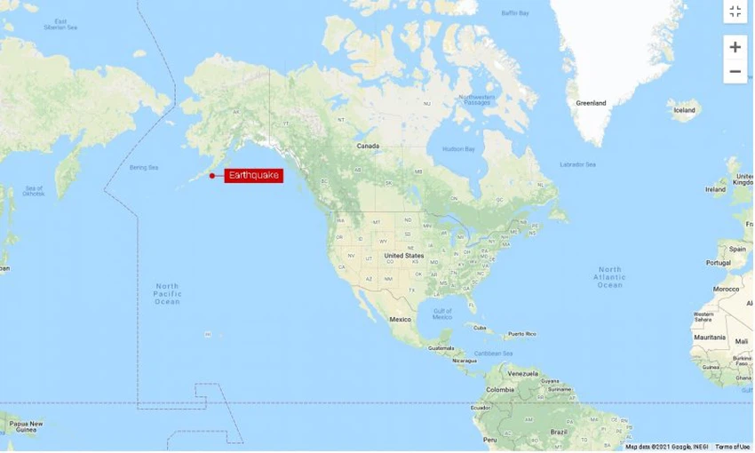 حيث وقع الزلزال القوي على بعد (91 كيلومترا) شرق جنوب شرق بيريفيل ، ألاسكا ، ووقع حوالي الساعة 10:15 مساء يوم الأربعاء. بالتوقيت المحلي. وعلى عمق (46.7 كم) ، هذا يعني أنه زلزال ضحل، إذ يتراوح عمق الزلازل الضحل بين 0 و 70 كم.