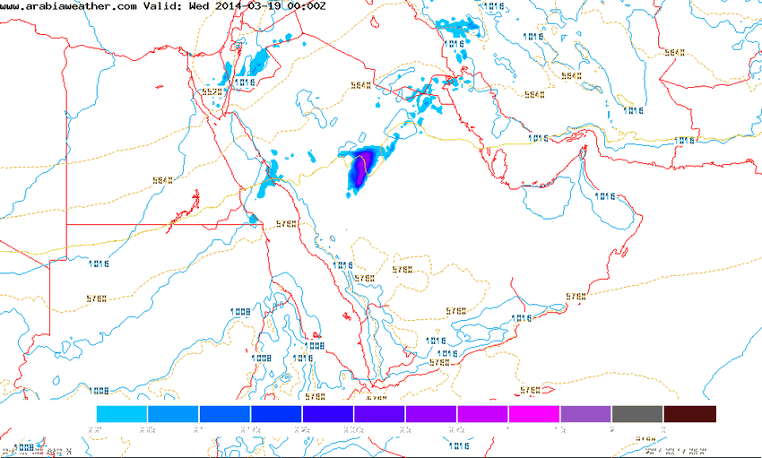 احد الخرائط التي يحصل عليها مركز ارابيا ويذر الاقليمي والتي تشير الى عاصفة قوية محتملة على اجزاء من القصيم وحائل