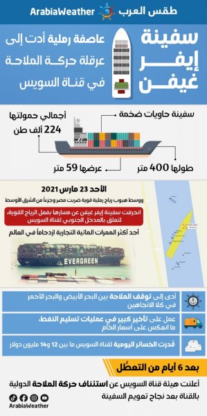 طقس العرب - قبل 6 أشهر كنا نتابع بترقُّبٍ بالغ أخبار سفينة الحاويات الضخمة إيفر جيفن (Ever Given) التي علقت في قناة السويس في يوم الثلاثاء (23 مارس/آذار 2021) بعد أن انحرفت عن مسارها، وأغلقت أحد أهم الممرات المائية في العالم، مما تسبب في ازدحام مروري هائل وتكدس للسفن في مدخل القناة، و تعطلت الملاحة البحرية وحركة التجارة الدولية عبر القناة لـ6 أيام.