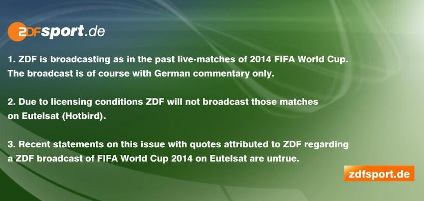 3) التصريحات الأخيرة بشأن هذه المسألة مع أقوال منسوبة لقناة ZDF و القائلة بأن القناة ستقوم ببث كأس العالم على قمر يوتلسات (هوتبيرد) هي غير صحيحة.