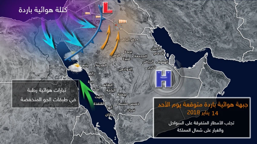 طقس العرب – م. ناصر حداد – تندفع نحو شمال المملكة اعتبارا من صباح الأحد كتلة هوائية باردة عبر شرق البحر المتوسط، تدفع بتيارات هوائية نشطة السرعة ومثيرة للغبار في أجزاء من المنطقة الشمالية، فيما تكون الفرصة واردة لتساقط زخات متفرقة خفيفة من الأمطار في سواحل تبوك وبعض المرتفعات الجبلية غربها بمشيئة الله.