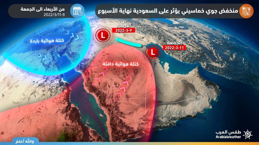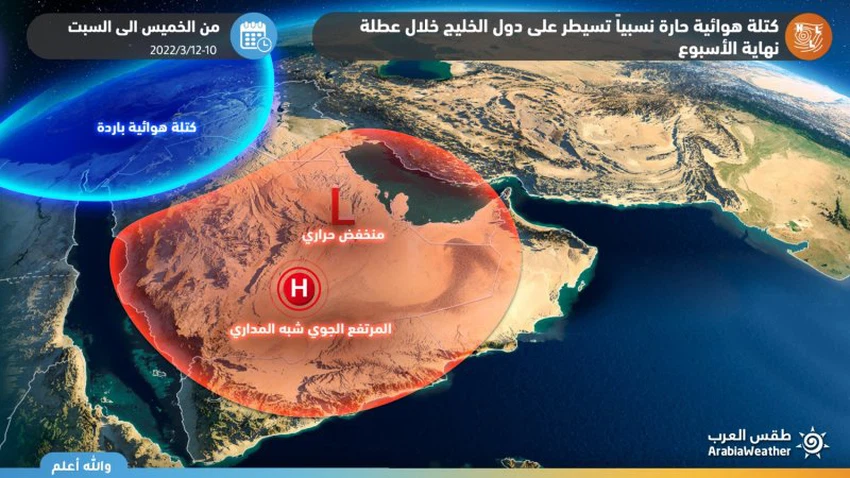 تتأثر الكويت بمشيئة الله يومي الخميس والجُمعة بتأثيرات مُباشرة لمنخفض جوي خماسيني يتمركز بالقرب من البلاد، بحيث توالي درجات الحرارة ارتفاعها يوم الخميس 10-03-2022 في عموم المناطق، وتُصبح أعلى من مُعدلاتها الطبيعية بكثير. أما يوم السبت ونتيجة اقتراب كتلة هوائية أقل حرارة وتأثير ذلك على قيم الضغط الجوي، فتنشط الرياح الشمالية الغربية التي تُثير الأتربة والغبار في العديد من المناطق ورُبما العواصف الترابية في المناطق الصحراوية والمكشوفة ويترافق ذلك مع تدني لافت على مدى الرؤية الأفقية في تلك المناطق.