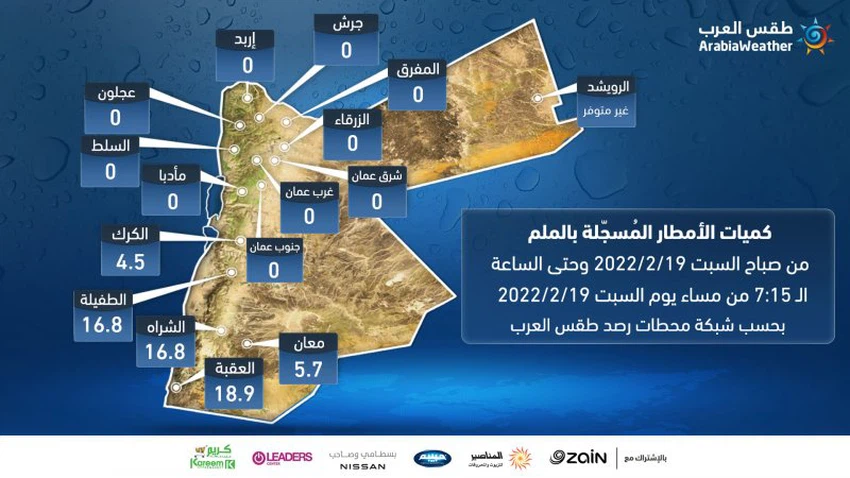 طقس العرب - تالياً كميات الهطول المطري المُسجّلة في الأردن من صباح يوم السبت 19-2-2022 وحتى الساعة الـ 7:15 من مساء يوم السبت 19-2-2022 بحسب محطات الرصد الجوي لطقس العرب :