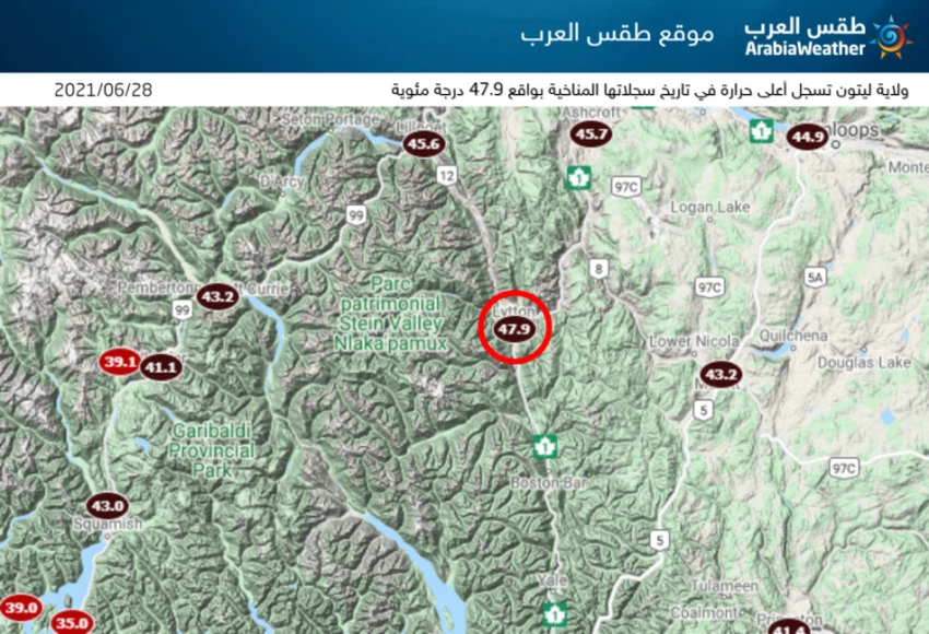طقس العرب - سجلت كندا رسمياً يوم الاثنين 28 يونيو 2021 أعلى درجة حرارة في تاريخ سجلاتها المناخية، إذ حطمت ولاية ليتون الرقم القياسي لأعلى درجة حرارة في تاريخ السجلات المناخية الخاص بكندا بواقع 47.9 درجة مئوية محطمة بذلك الرقم القياسي المسجلّ قبل 84 عاما.