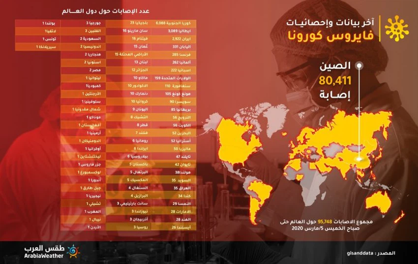 كورونا | تحديث الأرقام بعدد الاصابات في العالم حتى صباح الخميس 5 مارس/ آذار 2020