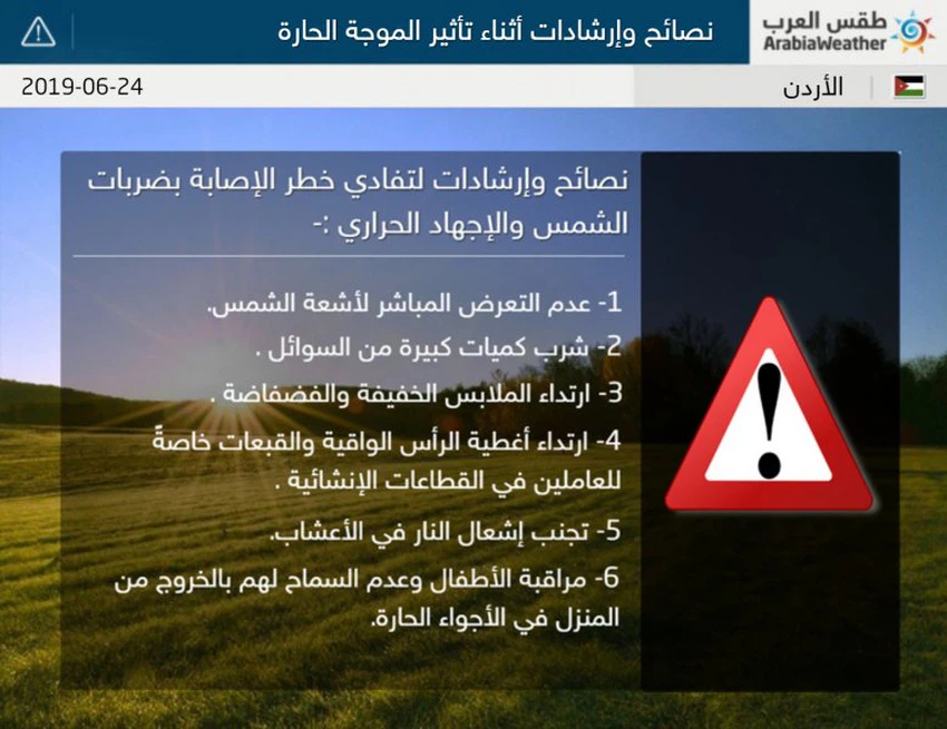 ويُمكن أن يتعرض الإنسان خلال هذه الأجواء الكثير من المشكلات الصحية، مثل ضربات الشمس والإجهاد الحراري، لذا ينبغي اتباع عدد من الارشادات والنصائح الهامة لتفادي تلك المخاطر أهمها: