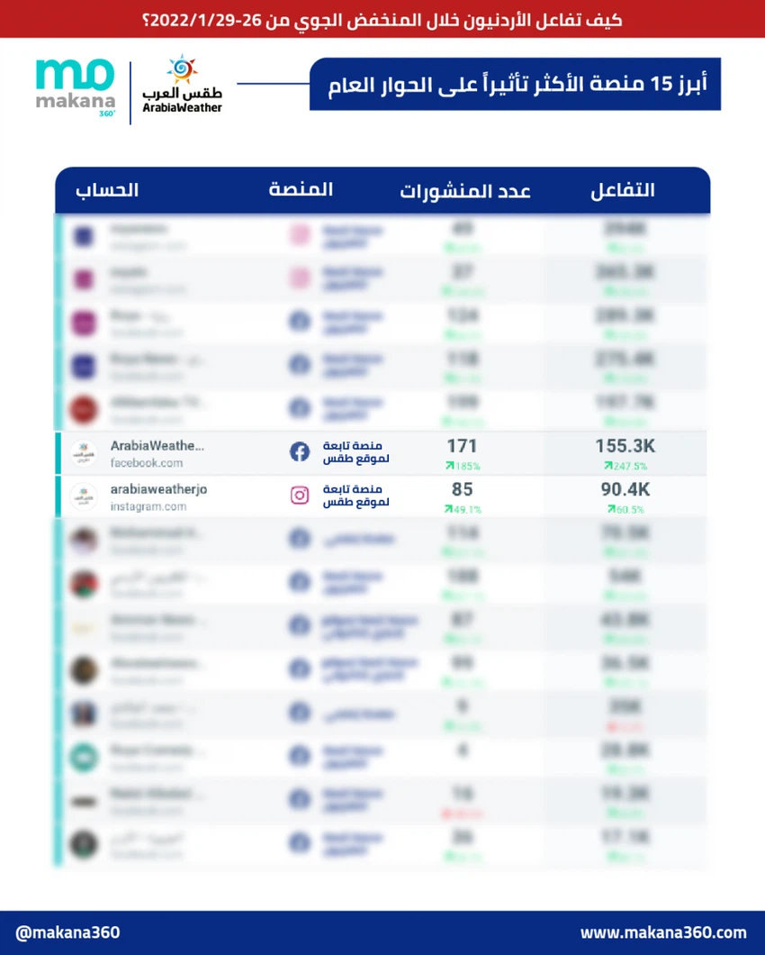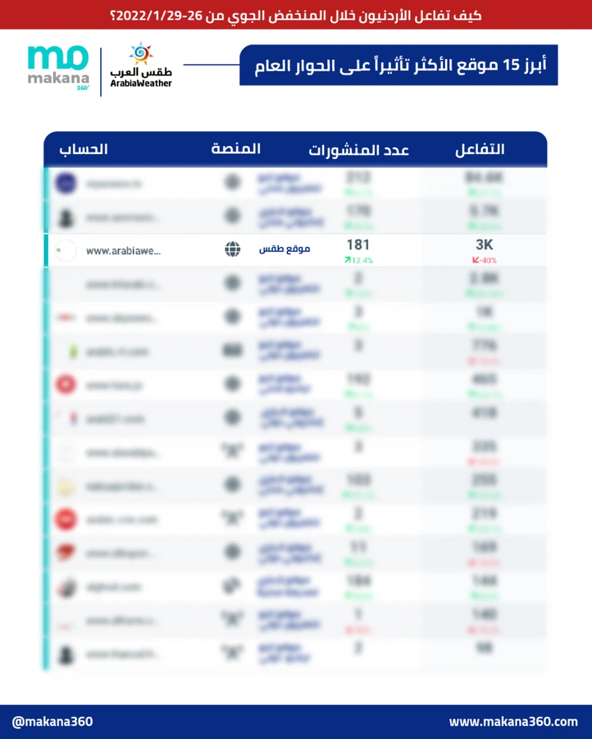 مكانة 360 – ضمن سلسلة الدراسات التحليلة للأحداث الرائجة والموضوعات المنتشرة والشائعة والتي يتم تداولها من قبل المواطنين، قامت شركة مكانة 360 لاستطلاعات الرأي والتسويق (Makana 360) بعمل دراسة تحليلية لحوارات المواطنين الأردنيين على صفحاتهم على مواقع التواصل الاجتماعي والمواقع الإلكترونية وتفاعلهم خلال المنخفض الجوي الأخير الذي أثر على المملكة عصر يوم الاربعاء الماضي 26 كانون الثاني 2022، حيث تم تحليل حوالي 67 ألف حوار (بوست) ومليون و600 ألف تفاعل (تعليق، اعجاب، مشاركة)، خلال الفترة ما بين 26-29 كانون الثاني 2022.