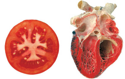 تشبه الطماطم القلب أكثر من أي فاكهة أخرى، وهي غنية بالليكوبين المعروف بغذاء القلب والدم. وثبت علمياً أن استهلاك الليكوبين يخفض من خطر النوبات القلبية. الطماطم هي مصدر ممتاز للفيتامين C الذي يلعب دوراً مهماً في صحة القلب.