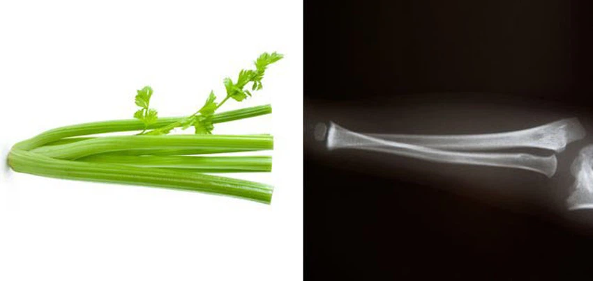 عِرق من الكرفس يشبه عظمة، وهو مفيد للعظم أيضاً. يحتوي الكرفس على السيليسيوم، وهو أحد المعادن التي تعطي القوة للعظم. إليكم أيضاً معلومة مذهلة : العظم يحتوي على 23 ٪ من الصوديوم، والكرفس يحتوي أيضاً على 23٪ من الصوديوم.