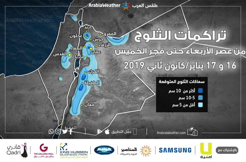 وعن تراكمات الثلوج وسماكاتها فيُتوقع أن تزيد بمشيئة الله عن الـ 10 سم في مختلف المرتفعات الجبلية العالية التي يزيد ارتفاعها عن 1000 متر عن سطح البحر، في حين تكون أقل من ذلك في باقي المرتفعات الجبلية التي يزيد ارتفاعها عن 900 متر