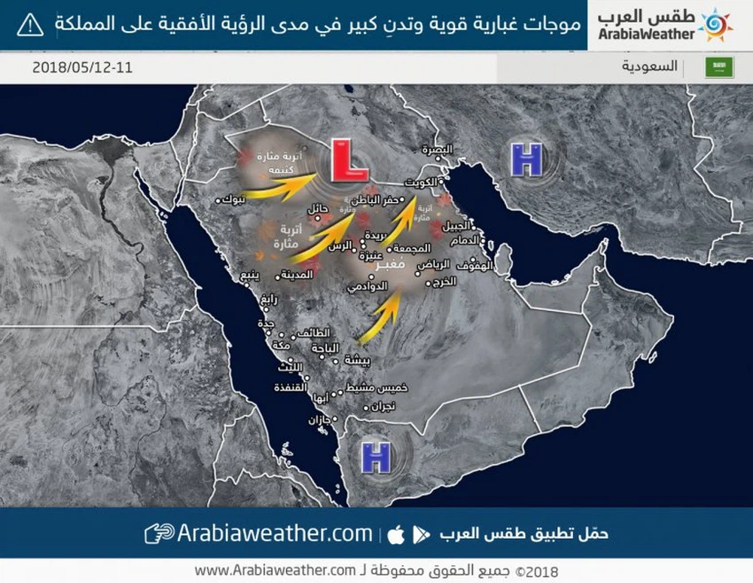 وفي التفاصيل فيُتوقع بمشيئة الله أن تهُب على المملكة خلال عطلة نهاية الأسبوع "يومي الجمعة والسبت" رياح غربية إلى جنوبية غربية نشطة السرعة مع هبات قوية أحياناً، تتجاوز بعض هباتها حاجز الـ 90كم، ما سيعمل على تشكل موجات واسعة من الغبار والأتربة تتسبب بتدني كبير وربما انعدام في مدى الرؤية الأفقية.